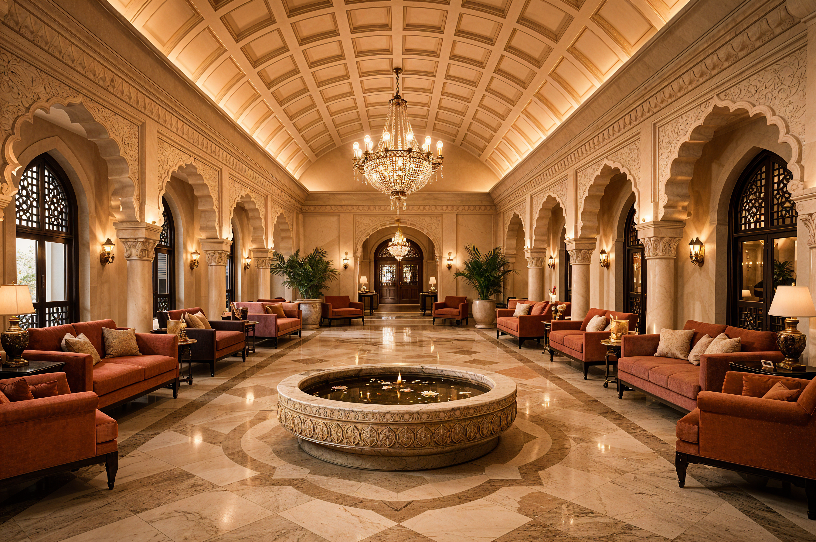 From the grand arrival lobby with its vaulted coffered ceiling and central water feature, to the heritage dining room with Mughal-arched alcoves and the intimate suite interiors with hand-carved jali headboards, every detail is an expression of craft-first design thinking — the philosophy that distinguishes luxury from mere opulence.